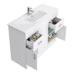 For a contemporary style in your bathroom or en suite, choose the Monza Modern Sink Vanity Unit and Toilet Package. With its gloss white finish and curved corners, this modern bathroom suite has a clean and minimalist design. The dual flush toilet projects just 490mm from the concealed cistern unit, which keeps untidy pipes out of sight. The vanity unit also comes with two roomy, soft close drawers for storing toiletries, so you can keep surfaces free from clutter. Pair this piece with the Bosa Mono Basin Mixer to complete your bathroom transformation.
