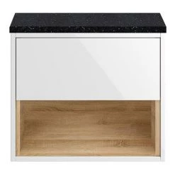 Haywood Gloss White / Natural Oak Wall Hung Countertop Vanity – 600mm w. Open Shelf + Black Worktop